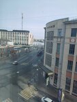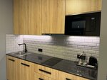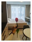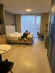 Были с мужем в этом отеле одну ночь. С 8 на 9 марта. Сформировались по итогу плюс и минусы. Плюсы: Стильное современное здание. Недалеко от метро и центра. Рядом набережная, из некоторых номеров точно видна. Из нашего был виден кусочек моста и реки. На рецепшне приятные администраторы. В честь 8 марта подарили один тюльпан. Мелочь, а приятно. Оформили довольно быстро, подписали две бумажки, выдали ключи и подсказали куда идти. Красивый стеклянный лифт. На этажах полумрак, но всё видно. Чисто. Коридоры длинные, с поворотами. Свой номер искали не долго. Номер светлый, солнечная сторона до обеда. Стиль студии минималистичный, современный. Очень удобный матрас на кровати, и подушки. Тело прям отдыхает. Спасибо большое! В номере были халаты, тапочки, полотенца и мыльно-рыльные принадлежности. Фен. Классное зеркало ванной комнате, с подсветкой. Теперь минусы: В номере было оооочень душно. Солнечная сторона. Но! Не работало окно, оно не открывалось. Есть в номере кондиционер. Но он тоже не работал. Мы позвонили вечером администратору (так как гуляли и вернулись в номер только вечером), на что администратор нам сообщила, что зимой кондиционеры не работают, это нормально. А окно должно открываться. Мы сказали, что оно не открывается, но ручка поворачивается, идет шум улицы, но воздуха практически не идёт. На что администратор сказала, что оно должно открыться чуть-чуть. Возможно это и было чуть-чуть, мы не поняли. Но администратор, не среагировала на проблему и не решила её. Мы остались в душном номере, с мизерной щелкой. У меня даже заболела голова от духоты. При выезде из отеля, другая администратор сказала, что окно должно открываться нормально, извинилась, и предложила кофе. Мы отказались, так как хотелось скорее выйти на воздух. Дальше из минусов, грязный стульчак на унитазе. Весь в каплях и подтеках. Видимо его совсем не протирали перед нашим заездом. Во время принятия душа вода вытекает из под стеклянных стенок душевой кабины и течет к раковине, туалету. Потом просто не зайти. Тряпки половой нет. На кухне нет ни одного полотенца. Хотя бы маленького. Брать из ванной полотенца не хотелось. Ограниченное количество посуды (но это наверное не минус, а просто мы это заметили), так же не было соли. Только 4 пакетика чая и 4 пакетика сахара. Фирменная бутылка с водой. Которая пополняется перед каждым заездом гостей. Бутылка с эмблемой отеля, ее можно привести как сувенир за 2000 р. В целом, мы хорошо провели время вдвоем. Никто не отвлекал, не шумел и не мешал. Но воздуха нам не хватало катастрофически. Видимо просто не повезло.