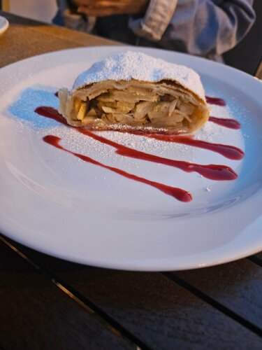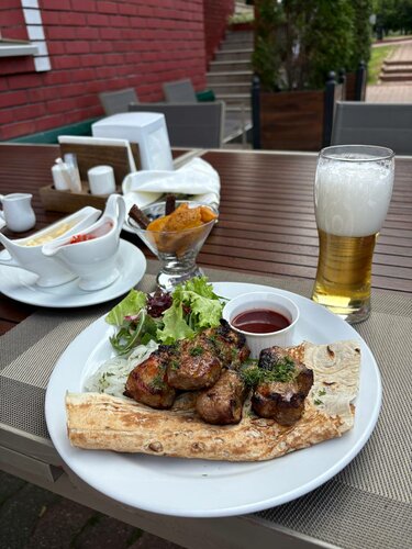 Снова открыто! Вечером взяли чай и вкусный штрудель. Пива пока своего ещё нет. Завтра зайдем на обед, заценим. Официант очень вежливый, приятный. Посидели на улице, прекрасно! Шашлык вкусный.