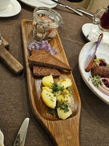 Сет настоек для согрева нормально! Ресторан уютный и красивый, сервис прекрасный. Успели сравнить несколько ресторанов Кировска. Есть большая детская комната. Вкусные местные закуски. Паштет, селёдка, брускетты с рыбой Единственный минус, очень быстро принесли горячее.