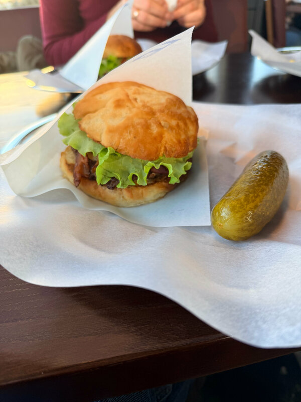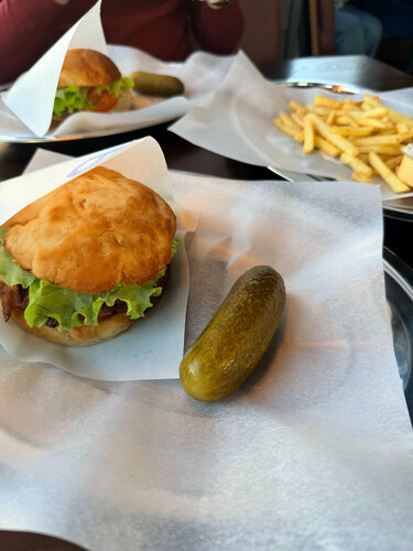 Для быстрого перекуса , хорошая бургерная ! Взяли два бургера и одну порцию картошки фри с двумя маленькими бутылочками колы . Цена 2500 р., московские цены какие-то . И это не самые дорогие бургеры по 700-800 р . Там были и по 900 рублей 😀 Вкус бургера и цена немного не соответвуют, но это на любителя конечно ! К бургерам положили соленый огурец. Первый раз вижу такую подачу бургеров!