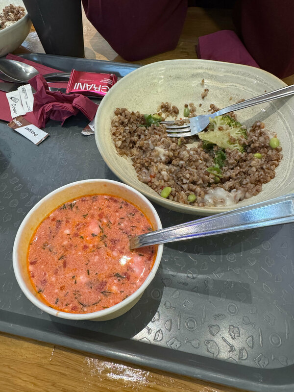 Не знаю почему все хвалят обычную гречку , тем более она безвкусная вообще. Я в шоке что можно запороть гречку с курицей чтобы это было настолько без вкусно что даже перец не помогает. Борщ дали холодный но после гречки я даже уже не расстроился особо. Если пополнить грубо свой белок и углеводы наверное норм, получить эстетику вкуса - точно нет. В русской кухне обычно фигурирует хлеб, коего нет.