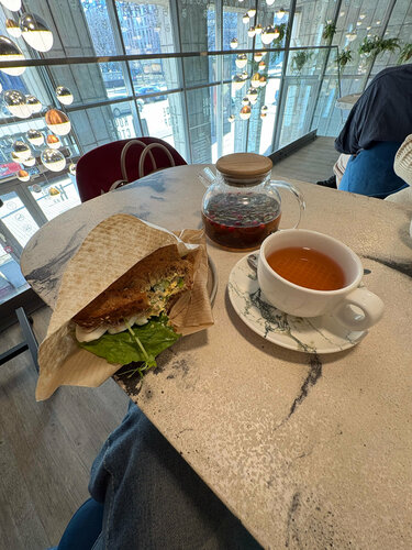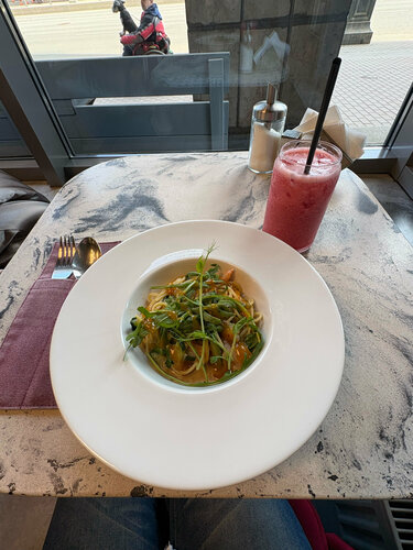 Зашла случайно, в итоге - теперь это одно из моих любимых мест. Само заведение уютное, лично мне нравятся панорамные окна с видом на главную улицу, атмосферно, особенно на втором этаже если сидеть. Приятный сервис, качественный кофе, достаточно большое для кофейни меню и пока все позиции, которые я пробовала, вкусные, красиво оформленные. Все свежее, без последствий. Интересные чаи и лимонады на основе фрешей. Горячая сочная паста!🤌 Считаю, что качество соответствует цене, учитывая еще удачную географию заведения. Люди тут всегда есть. Лично от себя рекомендую сэндвич с тунцом!