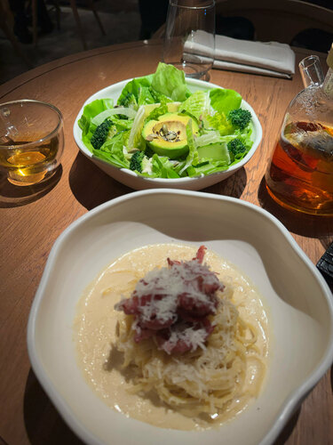 Как всегда плотная посадка,что говорит-место стоит того! Вкусные блюда:я взяла пасту и зелёный салат с очень вкусной заправкой,но больше всего покорил в этот вечер десерт, «наивкуснейшая» Павлова ❤️