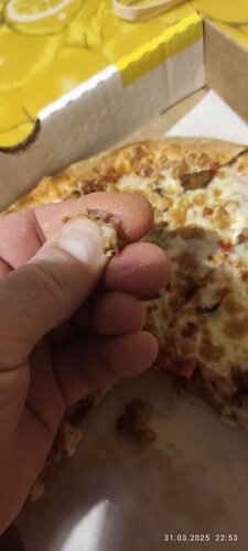 Вот не ходили примерно 6 месяцев. После того как у ребенка 8 летнего заболел живот, из-за Кучи майонеза в пицце. Решили всё равно подтвердить уверенность в качестве. Заказали 3 маленьких пиццы. В итоге есть не стали. Выкинули. Мяса нет .. от слова Совсем. Вонь несусветная соевым мясом и говяжьим жиром. (В СССР были такие жировые брикеты с таким запахом). Ч итоге мясная пицца без мяса. Вместо него какой-то мелкий фарш с кучей жира, моей и хрящами. Наверное остатки переработки мясокомбината. В рыбной дорогой оказалось мясо дешёвого Маринованного лосося. На вкус соленый с уксусом. Вкуса рыбы нет совсем. Никогда там не советую заказывать. Это то же самое как и у папы Джонс, который рядышком . Там тоже соя.