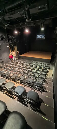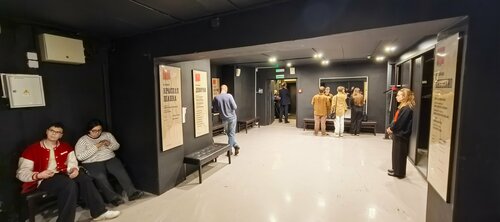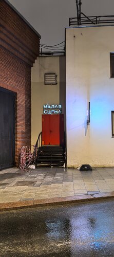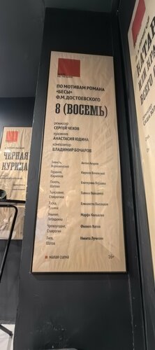 Камерная сцена в составе «театрального комплекса» на Таганке. Хоть она и расположена в том же здании что и Основная, и Новая, только, найти ее не так просто. Расскажу (и покажу на видео) как. С ул. Верхняя Радищевская (где расположены входы к главным сценам), Вам нужно свернуть на ул. Высоцкого. Там, несомненно, увидите гигантскую надпись «ТЕАТР» и ,чуть пониже, «малая сцена», !но Вам не сюдой =), а дальше по улице, тудой, где, если приглядеться, увидите плохо читаемую «неоновую» вывеску малая сцена с указателем-стрелкой за угол, вот, заворачиваете, поднимаетесь по ступенькам к красной металлической двери и вы внутри. Кстати, пешком от выхода №1 станции Таганская кольцевой линии метрополитена идти, буквально, пару минут. Попадаете в небольшое же фойе с импровизированными гардеробом (хитрый, многоярусный шкаф-купе) и баром (буквально два ящика с нехитрыми, но не дешевыми, напитками и закуской). Здесь можно скоротать время в ожидании спектакля: поизучать афиши идущих и прошедших постановок, привести себя в порядок у большого зеркала. Если вам нужно в туалет, то необходимо спуститься в цокольный этаж, по лесенке, расположенной непосредственно у входной двери. Зрительный зал – небольшой, на, примерно, 100 мест. Ряды расположены амфитеатром, поэтому видно и слышно хорошо. А вот стулья, на мой «взгляд» =) жестковаты. Теперь к постановке (01.03.26 давали «Восемь») . Здесь, как никогда, оправдывается репутация Таганки, как экспериментального театра, как по подаче материала, так и сам, собственно, материал. Представляет собой поочередные диалоги некоторых героев романа «Бесы», олицетворяющих различные грехи с, непосредственно, главным «бесом», т.е. одним из главных героев, Николаем Ставрогиным. Чтоб было хоть чуть понятно, что к чему, то перед походом в театр, надо «быть в теме», если не перечитать роман, то хотя бы посмотрите сериал одноименный (там 4 серии). Актеры подавали материал достойно как по эмоциям, так и пластически. Хорошо, что «исповедь» очередного греха сопровождается надписью по-русски на экране, а то не все умеют читать на латыни. В общем, мне понравилось, и всем, также, рекомендую посетить!