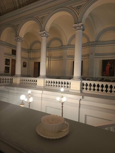 Очень атмосферно. Парадная лестница, дворцовые интерьеры, небольшая приятная комната- кофейня. Хороший кофе, интересные кофейные напитки. Есть десерты к кофе. Небольшой ассортимент, но все со вкусом во всех значениях этого слова. Рекомендую.