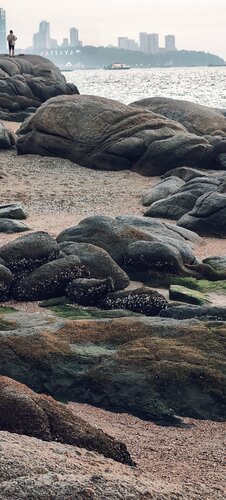 Вонгамат (Wong Amat) 🚩 в северном районе Паттайи — Наклуа Хороший пляж. Вода настолько прозрачная и чистая, что купаться одно удовольствие. Отличное качество песка на довольно широкой береговой полосе и не сильная загруженность туристами в самое пиковое дневное время. Места вполне хватает для комфортного отдыха, чтобы не толкаться с соседями и не перепрыгивать через обугленные тела, направляясь к освежающим водам Сиамского залива. Вход в море плавный, глубина увеличивается постепенно. К северу берег больше усыпан камнями, а на дне можно наткнуться на множество ракушек. Что отличает этот пляж от остальных - колоритность и живописные места, которыми обделены все остальные прибрежные зоны Паттайи. Вот такие фантастические виды, как на фото, можно встретить если прогуляться до самой северной точки пляжа Wong Amat. Лезть в воду в этом колоритном месте конечно не безопасно. Зато сюда приходят местные половить рыбу, а самые романтичные туристы почти каждый вечер встречают здесь фантастические закаты. Особенное впечатление произвели камни на берегу — природа создала удивительные формы и узоры, которыми хочется любоваться бесконечно.  Здесь можно провести целый день, наслаждаясь спокойствием, красотой окружающей среды и ощущением гармонии с миром.
