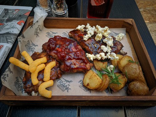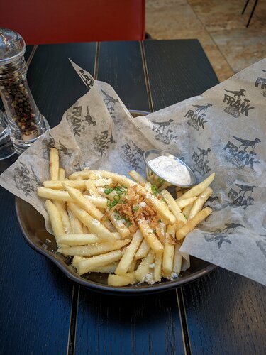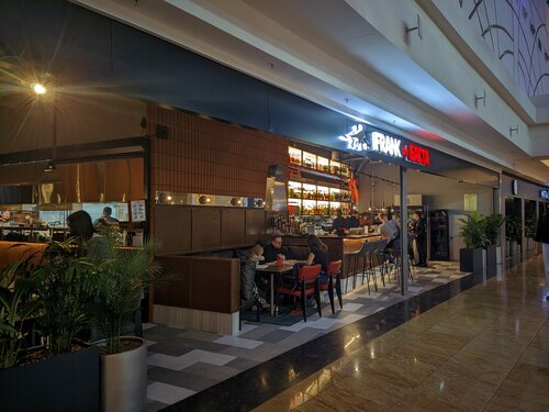 Не так давно посетил новую точку этой сети (28 августа). К сожалению, на тот момент мест внутри не было, поэтому предложили так называемую террасу. На деле она совсем небольшая и неуютная. На этом открытом месте атмосфера заведения теряется полностью, чувствуешь себя отщепенцем на обычном фудкорте, ожидая заказ из какого-нибудь среднестатистического заведения, вот только платишь ты столько же, сколько и остальные посетители Фрэнка. Первое впечатление было несколько испорчено ещё и подачей заказа. Не принесли приборы и салфетки ни до заказа, ни в процессе подачи первого блюда, его я отведал руками. Благо это была картошка фри. Но на ребрах другая девушка заметила отсутствие и принесла ведерко с приборами, за это скажем ей спасибо. А еще на террасе девушки стояли постоянно уткнувшись в экран телефона, уж не знаю по работе или так, но насчет этого душить не буду, просто бросилось в глаза. Теперь касаемо заказа: 1) Картофель фри с пармезаном и трюфельным маслом принесли моментально, будто блюдо уже было готово, удивился. В целом можно сказать, что название говорит само за себя, это просто хорошая картошка фри с добавками. Вкусно, но без эффектов "Вау", да и не ожидал их. 2) Лимонад вишня-гибискус подали совсем чуть погодя. Сладко-кисленький, но лично мне бы хотелось чуть большего ухода в вишню, тем более что после таяния льда гибискус практически весь вкус на себя забирает и напиток становится кислее. 3) Ребра ассорти: - Экстра хот острота точно не Экстра. Но сами ребра нежнятина. Посыпано кукурузными палочками Читос и вот это смотрится странно. - Вишневый BBQ - очень вкусный соус и вишенки, однако ребра попались сильно жестче и хуже отрывалость мясо от кости. - Перечная кола - вкус колы практически отсутствует, просто приятный соус. Сами ребра - что-то между первыми двумя и лучше б именно они были под вишневым соусом. Однако зачем тут попкорн не совсем понял. Чисто для оформления не то чтобы это смотрится, а вкусы не сочетаются. - Еще подавался картофель к ребрам и это просто неплохой запечённый молодой картофель, не хватало каких-то специй, а целиковые картофелины были недоготовлены внутри. Читос и попкорн, на мой взгляд, лишние, но, по всей видимости, насыпают чисто для визуала, в соцсетях выложить, это ж необычно. Первое впечатление от посещения этой точки выдалось двояким, но не негативным. Да и оформление места, как видно по фото, очень достойное, за исключением... Ну вы поняли. Снизил только на одну звезду так как у меня большой кредит доверия к сети и надеюсь все недочёты будут исправляться. Всё же точка совсем новая и на старте может хватать разного рода проблем.