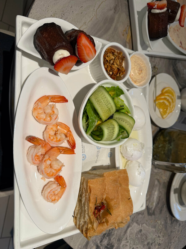 Шли туда ради завтрака! И не зря шли)) Еду принесли за 5 минут. К основному сету еще идет йогурт с мюсли и канелли. Мы даже съесть это не смогли, очень сытно)) Папа брал завтрак с крабом — по вкусу реально краб) но он подается в виде намазки интерьер классный, туалет особенно 😀