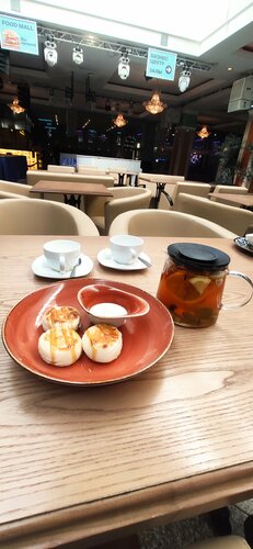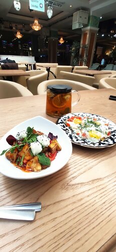 Очень вкусненько позавтракали в "Зам-зам") Заказали шакшуку, тёплый салат с баклажанами и сырники. Шакшука вкусная, хотя, на первый взгляд белок показался слишком жидким. Тёплый салат с баклажанами приготовлен по классическому рецепту. А вот сырники - на любителя, на вкус как запечённые, ещё аромат очень перебивал ванилин. А да, брали ещё чай - ташкентский вроде бы назывался, с разными пряностями и специями - бодренький.