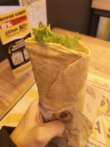 Местная рецептура шаурмы, что называется, на любителя. Но мне скорее нравится, поскольку вкус действительно превосходит популярные варианты из 2010-х. Радует, что вегетарианская шаурма 220 рублей, по нынешним реалиям нашей всепобеждающей страны, чьи цены бьют рекорды стремительнее Усейна Болта, даже дёшево. Правда, и сытность далеко не самая колоссальная. Внутри более-менее приятно находиться. Вердикт - очень хорошо, советую, владельцы держут марку качества с 2018 года, пусть первый филиал уже сгорел и, в отличие от Собора Парижской Богоматери, не был отреставрирован (