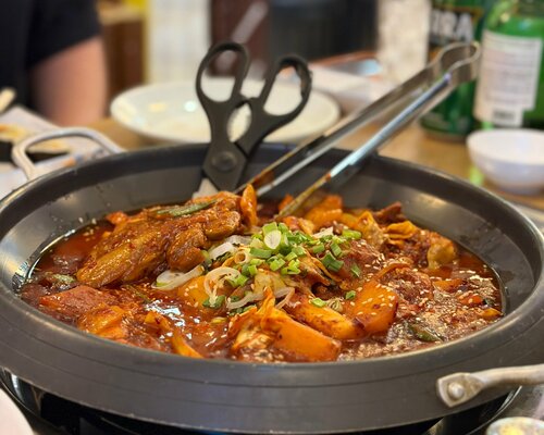 У меня восточных знакомых не нашлось, но как говорится дай русскому человеку только повод, поэтому мы с друзьями отметили корейский новый год чуть заранее и сходили в настоящее корейское барбекю Синла, и погуляли так нехило — вчетвером оставили больше 20 т.₽. Вот что мы в этот вечер попробовали: Токпокки (1200₽ / 600 гр.) — хорошая большая порция отличных токпокки, идут с яйцом и парочкой вонтонов. Со Кальби Саль (3500₽ / 200 гр.) — мраморная говядина для гриля. Всё свежее, качество отличное. Есть надо, заворачивая в лист салата с закусочками и соусом. Самгёпсаль (1500₽ / 250 гр.) — свиная грудинка для гриля. Всё-таки я понял, что свинина не моё в этом случае, говядина гораздо вкуснее. Таккальби (3000₽ / 900 гр.) — большое блюдо с курицей и овощами, которое ставится вместо гриля и томится на газу. Острое, но очень вкусное. Чан-о доп паб (1900₽ / 450 гр.) — по сути это известное японское блюдо, когда на рис кладут свежеприготовленного угря, смазанного соусом унаги. Где они нашли свежего угря в Москве — ума не приложу, но факт есть факт. Блюдо шикарное, мне очень понравилось, угорь нежнейший и прекрасно сочетается с рисом. Несмотря на цену, я обязательно сюда за ним вернусь и не раз! Кимпаб (950₽ / 300гр.) — главное расстройство вечера. Я бы сказал так — худший кимпаб, который я ел когда-либо, брать не советую от слова совсем. Остальная часть счёта ушла, конечно же, на напитки,и большая часть — на соджу (1200₽) с корейским пивом Terra (450₽). Прикольно, что под пиво приносят специальные стаканчики, в которых сразу показано, в каких пропорциях смешивать. Что по итогу — да, цены здесь немаленькие, но нам всё (кроме кимпаба) очень понравилось. Так что, как говорится, иногда можно себе позволить.