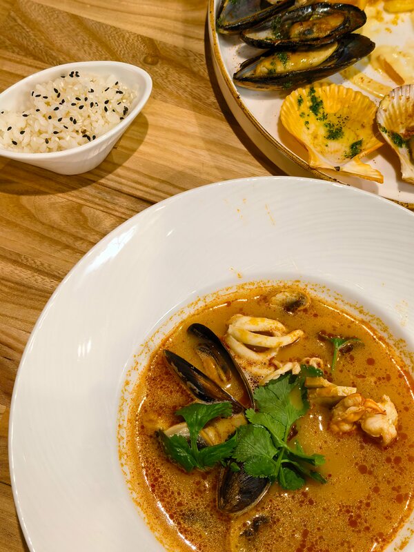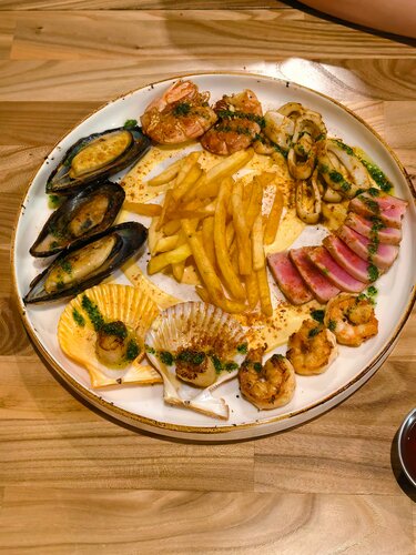 Да круто, да интересно, да красиво, да эстетично, НО ПЕРЕОЦЕНЕНО... 🗨️ Первое чему я прям супер пупер дупер удивился, когда мне сказали, то что нужно идти на кассу, там делать заказ и оплачивать СРАЗУ ЖЕ, я не из тех людей чья самооценка на уровне галактики, но даже мне это показалось странным, в связи с ценами в данном месте, ещё в дополнение невозможно остановить чаевые официанту потому что каждое блюдо приносит новый офик и это вводит полную бурмалду Я взял вероятно основные позиции в данном заведении, что бы сделать для себя более менее оправданное суждение и я его сделал Начнем с исполина данного заведения и судя по его названию вы сами понимаете о чем пойдёт речь, все правильно о мидиях Они действительно хороши, много, не пересчитывал, но считаю, то что не меньше 20 штук, я брал в соусе том ям и они меня приятно удивили, остроты конечно там не было, но основная вкусопередача на высоте И к сожалению на этом все вкусовые фантазии заканчиваются Салат с тар таром из тунца это конечно фиаско братан, безвкусно, соус по консистенции близок к воде и в принципе из вкуса салата там только этот соус Риет - это те самые 2 кусочка хлеба, на достаточного любителя, по вкусу как паштет из рыбы, только нарезанный в виде Тартара Мини шашлычки из морепродуктов это мазафака, были подгорелые...... Думаю этим все сказано Томатная паста с мидиями, описывая вкусовые ощущения представьте, что вы взяли томатную пасту и консервированный помидор это все сварили, взбили и добавили туда пасты с мидиями, кисло, НЕВЕРОЯТНО томатно и к сожалению это не плюс.. Это полный щитофакарихиер 🥷 Выводы делайте сами, всем движ Париж обнял поднял