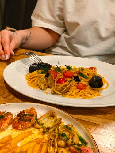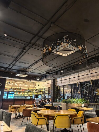 🤙 Бывали там вечером и первое впечатление было лучше чем последнее.. Красивый интерьер, украшенный в предверие нового года, но жёстко голдящие гости сидящие рядом в таком месте это будет не маст хэв 💰 Цены на удивление средние, как и везде оставили +-4.000₽ на двоих + пиццу забрали с собой (хоть она нам и не понравилась, но все по порядку) В среднем каждое блюдо стоит 650₽ Лазанья по вкусу была как с каким-то "адиколоном", честно не могу словестео описать на что была похожа приправлена она, кроме этого слова Салат с кальмаром база, безвкусный, вкус только за счёт соуса, но по моей статистике такая картинка везде где я пробовала подобное Карбонара пересливочена по вкусовыми ощущениям, если кратко внятно и понятно ХачаПури прикольненькое, много выбора необычной движухи, мне зашло 👉 Скорее главный Минус вайб, то что при вопросе у официантки сколько займёт вся подача блюд было озвучено не более 20 минут, но к нашему удивлению последнее блюдо мы получили через час и десять минут, были там в пятницу вечером Всем кто слушал до конца грамота респект и уважуха, обнял