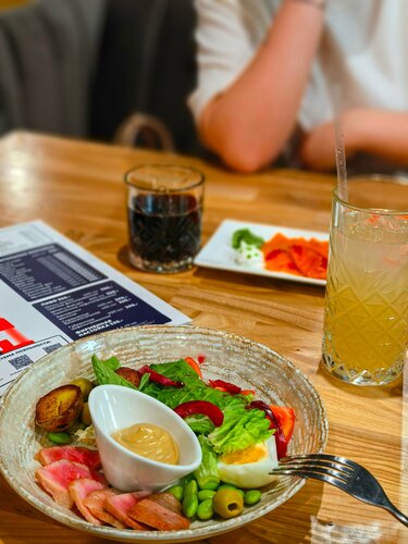 Посещали это место вечером в 20:30 и столы были забиты практически на максимум в помещении, так же веранда тоже была в хорошем достатке по клиентам Но мы не об этом, нам главное на сколько это зубодробительно вкусораздирающе и суетунаводящие блюда Сначала пробежимся че по чем, все что вы видите и + десерт обошлось на двоих в 3.600₽, в принципе цена адекватная с учетом локации и того что мы наелись, всего было 2 лимонада, 2 салата, 1 первое блюдо, 1 ролл и 1 десерт Мне понравилось все, от количества порции до вкуса, а самое главное это время, время за которое нам это принесли, мы не успели и чихнуть как к нам на стол уже упали салаты, а пока мы их догрызали уже и первые блюда так же упали на стол Официант по кайфу отработал, четко внятно и понятно, но не понял мува с его стороны, когда мы сидим и точим салатики подойти и спросить понравилось ли нам, когда не прошло и пары минут с их появления Так же тема с бронированием столов с депозитом очень необычное решение, всем кто захочет забронировать стол, то вам объяснят через какой сайт это сделать, а там все элементарно Уопщем и целом, нам все понравилось, усем REKOMENDеишен!
