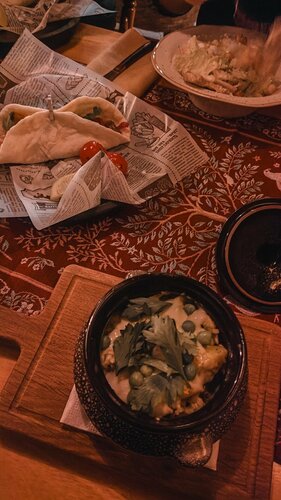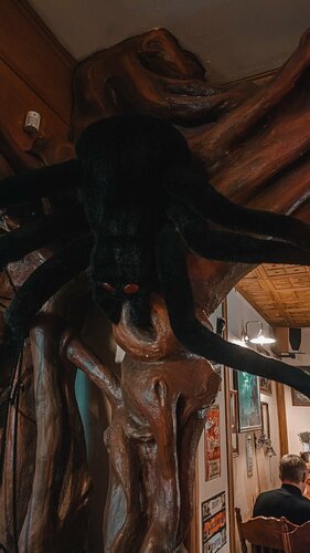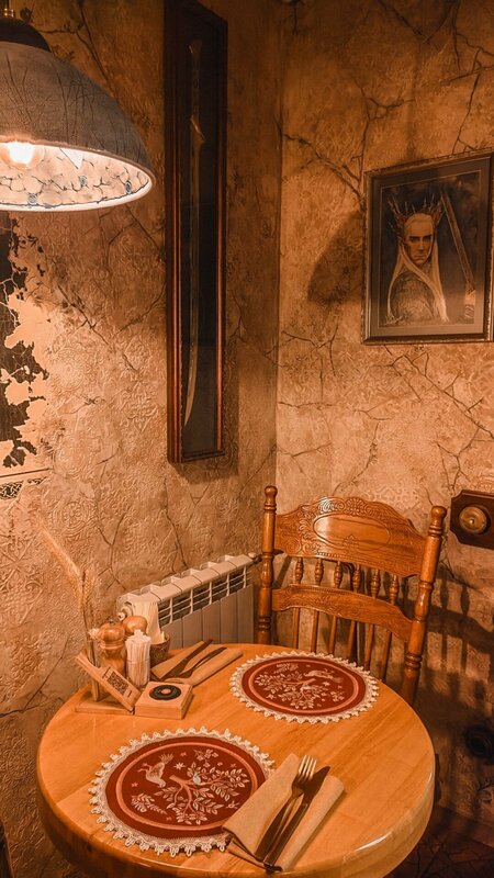 Очень уютное место. Хочется постоянно рассматривать интерьер. Удобные стулья с мягкими подушечками, но столы на четверых немного маловаты. Меню разнообразное с интересными названиями. Брала эльфийский горшочек с курицей, яблочный штрудель и дабл раф. Мне было вкусно. Наелась от души. Штрудель небольшой, но подаётся с шариком шоколадного мороженого и ванильным соусом. Друзья заказывали салаты, брускету, пасту подношение эльфам и чай. Остались довольны. Обязательно вернёмся ещё)