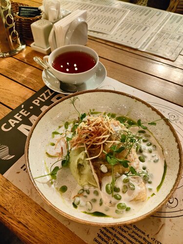 Отличное заведение от Mario. Меню в принципе одинаковое и местоположение друг от друга недалеко. Брали судак в сливочном соусе с картофельным пюре и зелёным горошком. Рыба очень нежная, картошка вкусная. Чай пряная вишня теперь мой фаворит из всех чаёв - вкусный, сладкий, сахар сыпать дополнительно нет необходимости.