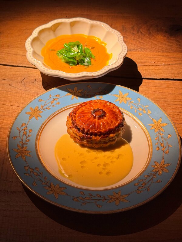 Обновляю отзыв по результатам второго посещения. Итак, первый раз было так. Приятное стильное место с европейской и итальянской кухней, расположенное на третьем этаже пространства Завод «Рассвет». Ресторан создан командой Big Wine Freaks, в котором я не была, но надеюсь добраться) Винная карта в ресторане «За крышей» очень интересная и непохожая на стандартную подборку, которая есть в среднем в любом ресторане. Даже по бокалам: брала креман, которые я нежно люблю, но именно такой ещё не пробовала. Ещё здесь очень уютно, без лишней пафосности. Интерьер теплый, в мягких природных тонах с элементами бохо и винтажными деталями. Здесь приятно и с подругой посидеть, и романтический ужин провести. Ещё надо сказать, что пространство между столами достаточно комфортное, нет лишней скученности, когда ты с соседним столиком практически в одной компании сидишь. Брала запеченую свеклу: классная закуска с тёплым, чуть дымным, с лёгкой сладостью вкусом. Пробовали тыквенный суп: густой, согревающий, с кремовой бархатистой текстурой и мягкой ноткой сладости. Суп дополняют грибами (что-то благородное, белые, насколько поняла). Тоже очень и очень достойно внимания. Брали пироги: с крабом и с мясом (оба вкусные и свежеиспеченные, не разогретая заморозка точно). А вот пасту с трюфелем я, честно говоря, не оценила. Трюфелем посыпано от души, но как будто бы чего-то не хватает. Сам трюфель без яркого аромата, скорее с запахом влажного леса (возможно это сам сорт трюфеля такой). Паста тоже выглядит как обычная покупная. На мой вкус не коронное блюдо: другие позиции из меню были интереснее и вкуснее. Обслуживание мне тоже понравилось: чувствовала себя желанным гостем. Официант подходил вовремя — не слишком быстро и не слишком поздно, тарелки убирали и приносили быстро, сидеть перед пустой тарелкой не пришлось, при этом никто не отбирал еду, когда ты ещё жуешь. Молодцы ребята, классный сервис. Резюме: уютно, комфортно, вкусно, обширная винная карта. Обязательно вернусь сюда ещё Второй раз вернулась поужинать и зря. Кардинально противоположное впечатление: официантов много в зале, а подходят редко, грязную посуду уносят не сразу. Постоянного официанта не было: сменились несколько раз. Попросила порекомендовать мне настойку похожую на лимочелло (в прошлый раз были рекомендованы очень удачные фруктовые позиции). Мне принесли какой-то крепкий напиток: едкий, горький, схожий чем-то с кальвадосом и ромом, ни разу не напоминающий лимончело. Пить не стала, но официант даже не обратил на это внимания. Тирамису - просто коржи под несоразмерной шапкой взбитых сливок, совсем не тянет на фирменный десерт. Попросили разделить счет - нам кивнули и принесли один общий. На выходе хостес даже не попрощалась. В общем и целом, не знаю от чего зависит здесь обслуживание, но идти сюда ещё раз совсем не хочется.