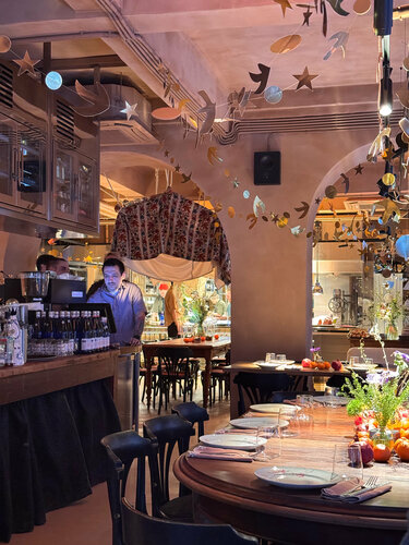 Были здесь на ужине: нам очень понравилось. Это современный индийский «тапас-бар» с акцентом на креативные блюда и коктейли. Бар включён в список Michelin Guide «Bib Gourmand» за 2024 год (отмечен как ресторан с отличным соотношением цена/качество и высоким уровнем кухни). Интерьер стильный, много зелени, с приятным светом и атмосферой, подходящей и для ужина, и для коктейлей. Обслуживание очень внимательное: к моей аллергии на томаты отнеслись максимально трепетно и вызвали шефа с кухни, который уже сам советовал блюда. Это было так мило. Меню в основном представлено небольшими порциями (например, 1 димсам), зато есть возможность перепробовать все. Мои заказы. 1. Креветка в кляре вкусно, со специями, очень много кляра 2. Гребешок в соусе: нежно перченый, гребешок слегка передержан-жестковат. Добавили к гребешку лемонграсс в тайском стиле - на любителя тайской кухни. 3. Charcoal chicken, hummus- в тайском стиле цыпленок на подушке из хумуса, также с лемонграссом. Пожалуй, самое вкусное из всего заказанного - пробовать обязательно. 4. Chicken shawarma-сочно, вкусно, шаверма) 5. Bread fritter, schezwan - обжаренный хлеб с мягкой серединой, которая пропитана чем-то вроде грибного/орехового соуса. Интересно, вспоминается детство, когда хлеб жарить было трендом. 6. Бар с артишоками: нам было слишком острым, не смотря на то, что просили помягче. Под завершение по совету официанта заказали тирамису: по вкусу немного отличается от классического, насколько поняли - молоко заменено на альтернативное. Но тирамису - лучшее решение после острой кухни: как рукой сняло все последствия. Выбор вина тоже отличный-есть европейские, новый свет и даже индийские. В целом очень интересный опыт, не экстремально остро (по просьбе и невероятно вкусно). Не зря отмечен Мишлен