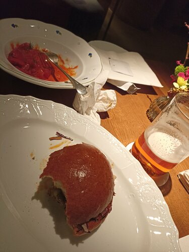 Здесь, из за бургера со рваным мясом 🥩 , хочу его попробовать 😋 , IPA на апперетив и ждем главного виновника 👀🤞 Бургер - зачет 💯, салатик с помидорами и соусом - мое почтение кухне и поставщикам 👍. Рекомендую к посещению 🫶