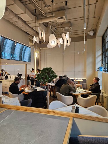 Место очень привлекательное. Внутри светло, уютно. Свет мягкий, мебель удобная. Из окон открывается вид на кластер Лаки с трубами дореволюционного завода. Обслуживание оперативное и приятное. Никита всё подсказал по меню, поинтересовался впечатлениями и рассказал о том, что проект из Тулы и сейчас активно развивается. Нам понравилось! Рекомендуем к посещению.