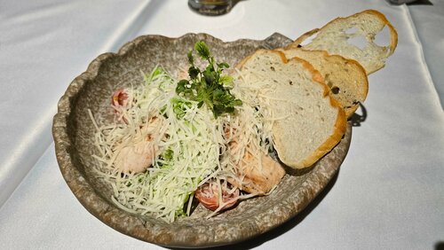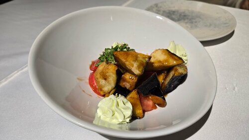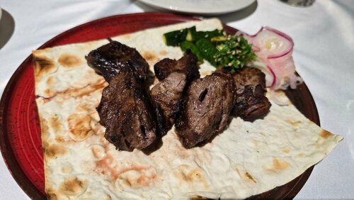 Заказывали салат с баклажанами, цезарь, мидии в сливочно-устричном соусе, шашлык из говядины. Еда посредственная, без изюминки во вкусе. Мидии мелкие, шашлык безвкусный, возможно плохо маринован. Цена, выше среднего. Порцию шашлыка предлагают от 300 гр.(100 гр. - 600 р.).