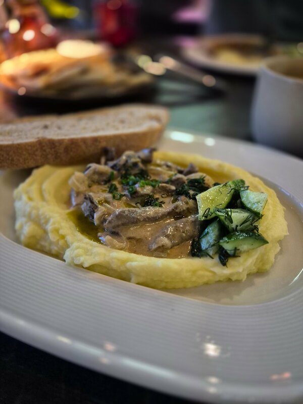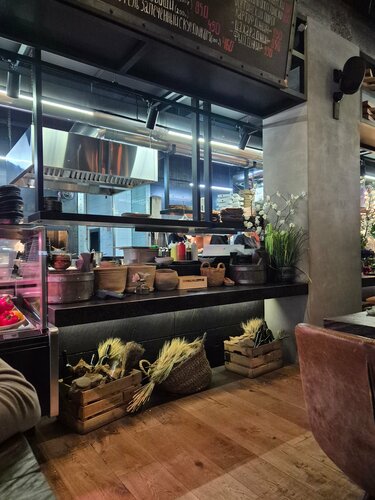 Отсутствует единый стиль: здесь японская сакура соседствует с инсталяцией с/х ярмарки, механистические люстры с плетёными абажурами, минималистичные деревянные столы и яркой, расписной посудой, какой-то странный симбиоз хай-тека, прованса и претенциозности в одном флаконе. Официанты заняты своим межличностным взаимодействием больше, чем гостями: уточнять порядок подачи блюд не станут, убирать грязную посуду будут, когда, наконец, заметят, подойдут, только если вы настойчиво начнёте махать руками. Тайминг приготовления и подачи блюд выдержан. Салат с грушей и креветками вкусный. Чуду подгорела, но нам её всё равно подали, топлёным маслом не полили. Бефстроганов, увы, не в сливочном соусе. Общая оценка кухни - на троечку, весьма средняя. Желания возвращаться не возникает.
