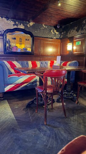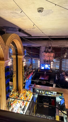 Из минусов подраные диваны, не очень внимательный персонал, неприятная девушка администратор, от стула не отрывается, гостей не провожает, блондинка, портит впечатление о заведении с старта. Из плюсов соответствует стилистике , снаружи вообще супер выглядит, кухня нормальная, цены средние, готовят быстро. Пива хороший ассортимент, вкусное.