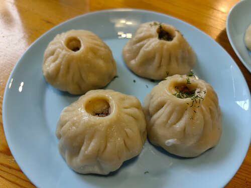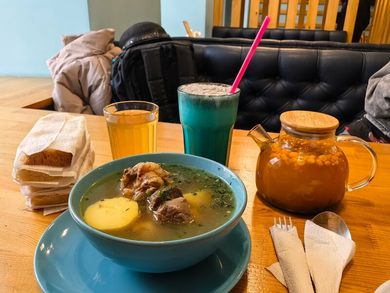 Небольшое кафе на 20 мест, недалеко от автостанции. В меню 2 вида поз, баншатай-шулен и большой выбор салатов. Неплохой компот, есть несколько видов пельменей. Готовят не слишком быстро, но для большой группы могут постараться. Специально для туристов, коротающих время до электрички: лучше всего приходить часа за 2 до времени отправления. За 1.5ч будет тесновато, за 1ч до приготовить успеют но придется брать все с собой.. Для большой группы разрешают сдвигать столы 👍 Фишка кафе - бесплатные тарелочки с фирменными сухариками на каждом столе