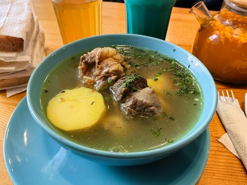 Небольшое кафе национальной кухни, очень "по-домашнему". Рубленые позы с неплохом ферментированным мясом, бухлер с бараниной (мяса не жалеют, но жестковато). Есть цуйван, но в этот раз брать не стал. К сожалению, в меню нет бурятского чая (и вообще чаев в чайнике) и блюд с потрошками. Давно наблюдаю это кафе, за 8 лет определенно прогресс в кухне и обслуживании. Буду очень рад расширению меню🙏