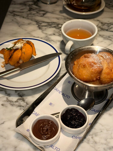 Были тут в Хэллоуин с подругой и поэтому поводу было специальное к празднику меню, которое тоже взяли на пробу. Заведение внутри красивое, уютное, в начале небольшая кухня-бар где трудилась девушка. 3 зала, 2 маленьких и 1 большой в центре. Слегка приглушенная атмосфера, приятное теплое освещение. Официанты милые, уточняют, помогают, но у нас их было 2 и один показался неопытным немного или был новичком. Мы были в субботу вечером и на удивление людей было ооооочень мало, возможно потому что она была рабочая или про это место ещё мало знают или же другая причина, по которой я сюда больше не вернусь. На пробу взяли необычный чай (название уже не помню, но не просто черный). Он не вкусный. Из специального меню был десерт в виде большой тарталетки из теста. По вкусу обычный и конечно не похож вообще на десерт. Из обычного меню пончики с черничным вареньем и шоколадным соусом. Это не плохо, но не особо вкусно. Варенье будто из магазина, а шоколад горьким оказался, я не люблю горькое. Вообще изначально думала, что по виду будет выглядеть как пончик, а похоже на комок теста из фритюрницы. Картошка фри с соусом хорошая, в целом сложно представить как картошку можно испортить. Подруге вроде бы не зашла она. Салат с персиком - не люблю такое сочетание, мне не понравился, но подруге было вкусно. Пончики с сыром внутри и икрой. Мне зашло, а подруге нет. Это единственное что мне показалось лучше из всех, но тоже не вызвало восторга. Разливают гостям бесплатную воду, это плюс заведению, спасибо за заботу! В общем место для одного раза, сделать красивые фото и на этом всё. Возможно сюда нужно прийти, попробовать завтрак и он будет вкусным. Но пока оценка такая.