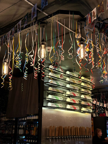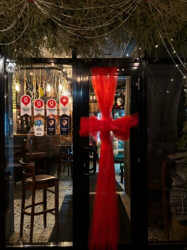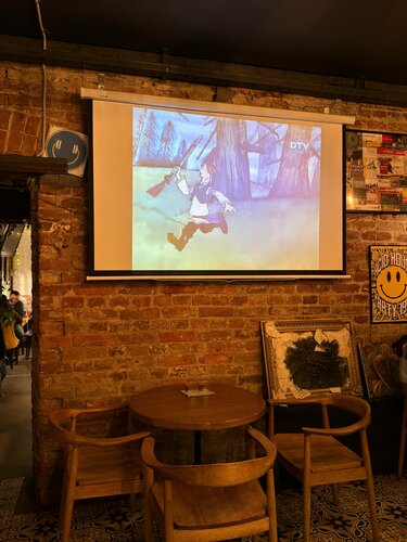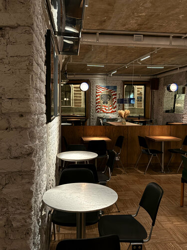 Заехала сюда совсем вечером в воскресенье после 8-9 поужинать! Внутри очень круто. В новогодней атмосфере украшен бар, по советскому стилю, рядом проектор показывающий старые мультики. В заведении два зала. Первый на входе, где большой бар и несколько посадочных уютных мест. Внутри свет приглушенный, создается более интимная атмосфера. Второй зал светлее, с тематикой перекликающимся с первым залом. Мест много. Обслуживающий персонал приветливый, милый, подскажет, поможет. Пока я делала фотографии стояли даже ждали, что вызывает умиление. Решила попробовать Бургер с курицей и обычный картофель фри. Бургер вкусный, конечно не вау, но хороший для данного заведения, картофель соленый в меру как я люблю и хрустящий! Меню необычное, в виде пластинки. По мне приятное место, хочется рекомендовать, без пафоса, со своей атмосферой и изюминкой!