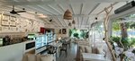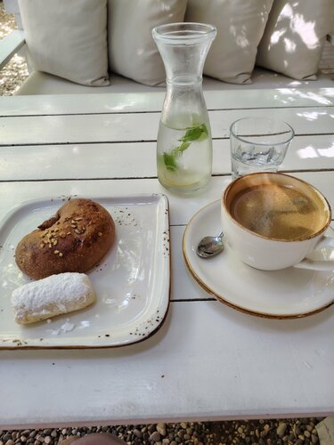 Очень милая кофейня. Любезный персонал, красивые разнообразные десерты, хороший кофе. К кофе всегда подают запотевшую бутылочку воды с мятой и лимоном. Приятная негромкая музыка. Обстановка располагает к релаксации. Вместо крыши густая зелень деревьев, через которая дает тень, но блики солнца дают красивое освещение.