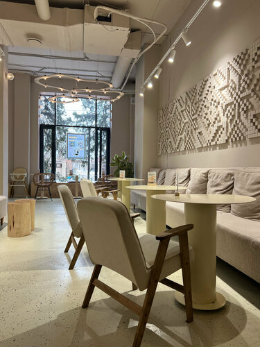 привлекательный интерьер! здорово что на районе есть где выпить вкусный кофе! приятный персонал и чистота даже в сан.узлах. пахнет кофем, выпечкой и отличным настроением) еще тут можно попросить фильтрованной водички! есть несколько небольших столиков, но и для нашей огромной компании в 13 человек нашелся уголок где все расположились ☺️ спасибо за гостеприимство, теперь буду чаще сюда приходить