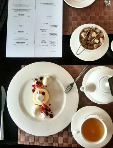 Уютно. Хорошее меню. Ничего неожиданного, но это и хорошо. Приятно заказать блюдо и получить то, что заявлено. Мне понравилась рыба. Много вариантов, вкус и оформление на высоте. Понравился выбор сложных чаев и десерты красивые и вкусные. Утром здесь завтраки для проживающих в отеле - даю высокую оценку. Большое разнообразие.