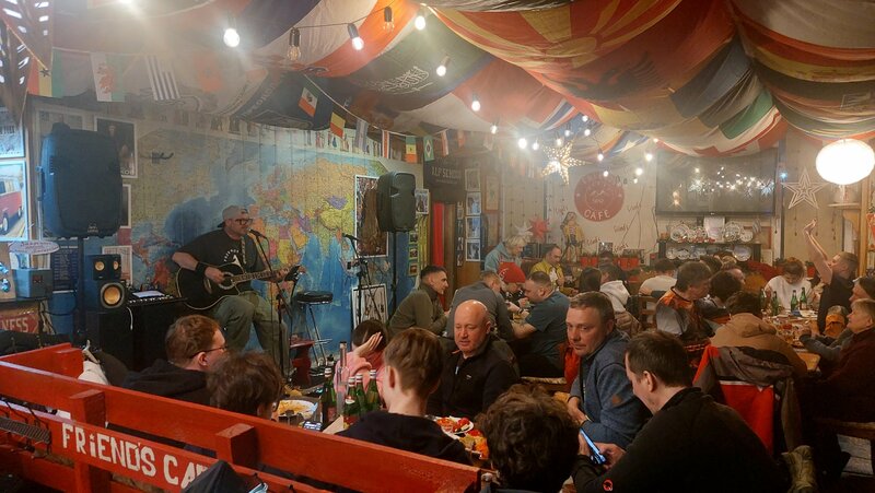 Атмосферное место, но не для еды. "+" живая музыка и позитивная публика. Интересное оформление. "-" долгое обслуживание (заказ ждал 1.5 часа, хотя гостей при заказе было не много), 50% еды осталось недоеденной: сухое жёсткое мясо, очень пересоленные блюда и т.п. Приборы к еде и чашки к чаю официанты не приносят в принципе: нужно просить отдельно и ждать по 10-15 минут. В туалете грязь, нет стульчака на обоссанном унитазе, возможность высушить руки (ни сушилки, ни бумажных полотенец). Так что если что-то выпить, послушать музыку и непользоваться санузлом, то ОК. Но не для покушать (а это была основная цель визита).
