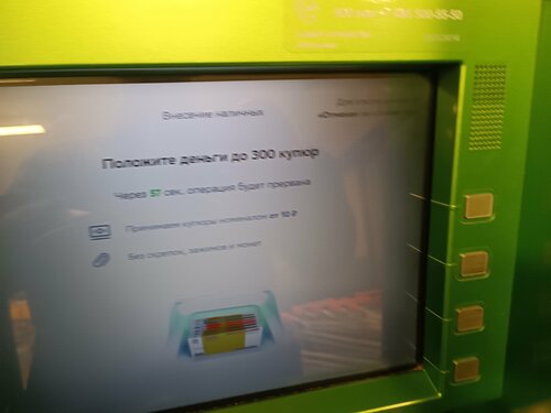 Работает на прием и выдачу денег. Принимает до 300 купюр за один раз, это много. Расположен у входа в магазин Дикси, можно в сам магазин не заходить. Но народу всегда много, банкомат популярен, поэтому если нужно выполнить несколько операций, лучше подгатывать на "мертвые часы"