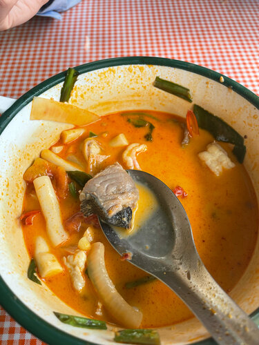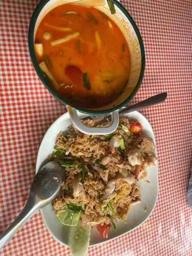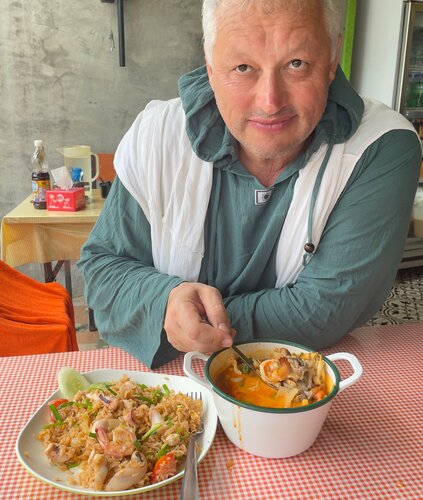 Вкусно, экзотика тайская - Муслим- нет поросятины и алкоголя. Рекомендую обязательно. Топ ям микс - эксклюзив - не везде готовят. Можно заказать пол порции. Порции большие. Том ям и коконат том ям делают отлично. Закрываются в 20.00- но не выгоняют 😍. Рядом маркеты и Маклае и рынок фруктов через дорогу и еда рыночная то же местный колорит. В меню картинки помогают разобраться с заказом. Даже тайский Английский знает только шеф повар- с остальными на пальцах объяснялся . Персонал приветливый , очень стараются. Интерьер дешевый , простой , вентиляторы . Много раз обедал и ужинал- ни разу не отравился. Хотя вид кафе намного шокирует, много местных здесь едят. На вынос то де готовят. Готовят быстро.