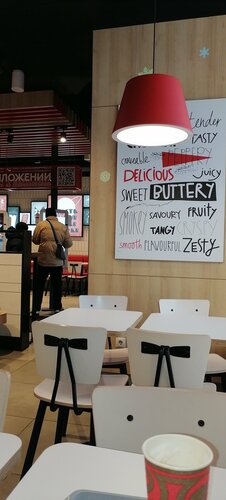 Приятное место для отдыха и встреч где можно посидеть, перекусить или покушать вкусно в тёплой и спокойной обстановке как одному так и с компанией. Просторный зал , чистые полы ,столы и стулья , красочно оформленные 🖌️ стены и празднично разрисованы окна в предверии Нового года 🎄 и конечно добрый , вежливый ,отзывчивый, приветливый персонал который работает тут ☝️ Тут всегда тихо , мало суеты и хорошая атмосфера , которая принесёт вам удовольствие и прекрасного настроения на весь день. А вот еще, как и во всех таких заведениях тут тоже есть где можно заказать еду не выходя со своего автомобиля , удобный заезд и выезд , хорошая большая парковка . Приходите , приезжайте тут всегда рады каждому клиенту.
