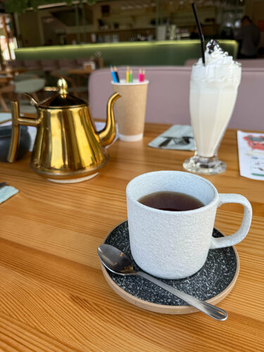 Хорошее местно. Средний ценник. Чисто и красиво как внутри , так и снаружи. Персонал приветливый, уровень обслуживания один из самых высоких в городе. Хотелось бы более разнообразное меню десертов. Хорошее детское меню, красивая подача . Мы остались очень довольны. Стоит отметить еще чистоту туалета, во многих заведениях города это прям проблема. Здесь все чисто и убрано. Насыщенный вкус чая. Однако пельмени для детского меню мне показались посолены больше нормы. Однозначно рекомендую к посещению❤️ А ещё тут есть карта лояльности , колесо фортуны , мастер классы.