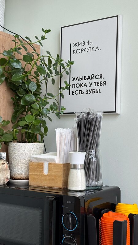 Жизнь коротка, улыбайся, пока у тебя есть зубы. Эта табличка висит в кофейне, но ведь кофе можно пить и без зубов: • Кофе вкусный, в меру горький и кислый • Приветливая бариста • В помещении чисто, тепло, светло • Есть еда: макаронсы, сырники и тд. Советую эту кофейню