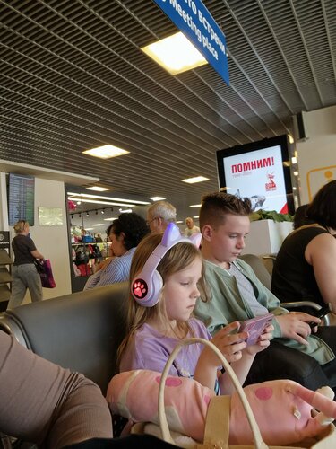 Красивый аэропорт, обратите внимания на девушку самолет... и ангела... Из минусов ценыыы, но это во всех так.. А ещё мало мест ожидания, когда задерживают рейс... с детьми сложно