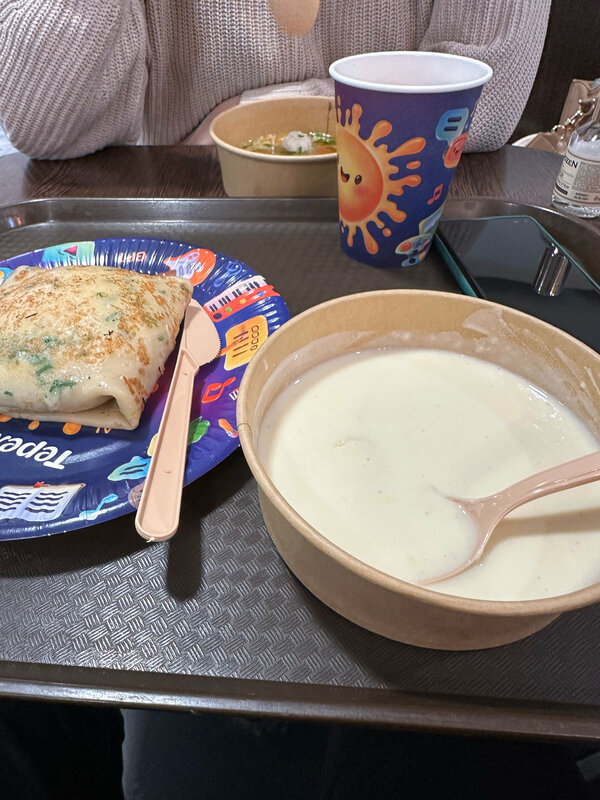 🍴 Быстрый перекус в полночь Когда кафе закрыты, а ты идешь с поезда уставший и голодный, замечаешь яркую вывеску в зимнюю ночь, сразу хочется зайти и быстро перекусить, чтобы продолжить свой путь до дома. Интерьер кафе современный, приятный глазу. Сотрудник приветливый (хотя было видно, что он хочет домой), обслуживание быстрое и четкое. Мы брали заказ с собой, потому что нам тоже хотелось поскорее домой) ✨ Что понравилось - выбор блюд: здесь готовят как традиционную шаверму, так и привычные нам блюда вроде по типу борща, куриного супа, гречки с митболами. - шаверма фалафель действительно хороша, порция большая. - упаковка, красиво оформленная, дарит эмоции. - быстрое приготовление блюд; - приятная атмосфера: светлое помещение, отсутствие других посетителей, удобные столики, хорошее освещение создают ощущение комфорта и домашнего тепла. ⚠️ Что могло бы быть лучше - гречка с митболами приятно удивила своим нежным вкусом и ароматом специй. Однако попадалась неперебранная крупа, такое встречаем ВПЕРВЫЕ! - качество ингредиентов, которое напрямую влияет на вкус как шавермы, так и горячего с митболами. Несмотря на некоторые недостатки, общее впечатление положительное. Если ищете место, где можно быстро перекусить и насладиться приятной атмосферой, то можно посетить.