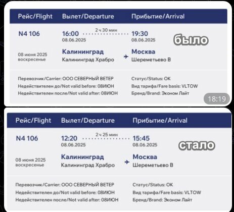 Случилось радость и мне на Д. Р. подарили билеты в Калининград и область на выходные. Я уже распланировал программу, заказал отели, расписал куда пойду гулять и где буду есть после трудовой недели и тут Nordwind присылает сообщение, что они сдвигают время вылета обратного рейса на 4 часа назад (вместо 16:00 на 12:00), т. е. это проснулся, попил воды и поехал сразу в аэропорт. Хотел где-то догулять и что-то посмотреть (фак_оф). Все воскресенье насмарку, потому что отобрали драгоценные часы моей поездки, мои деньги уже потраченные и создали негатив еще до поездки. Естественно, билеты других компаний уже сейчас стоят конских денег, даже если текущие вернуть или они прилетают слишком поздно в ВС, а там еще добираться от аэропорта домой и в понедельник на работу. Я летаю часто в разные места (в т. ч. заграницу), но такая ситуация со мной впервые. Спасибо вам большое. Предвкушая ответ компании, напишу заранее им тоже ответ: "Мне тоже очень жаль! Жаль, что МНЕ купили билеты в вашей авиакомпании. Больше допускать такого я не буду, тем более самому заказывать билеты. Знакомые также все узнают об этой истории. " Билет № 2166122886028 по заказу 438KCZ.
