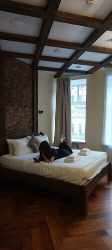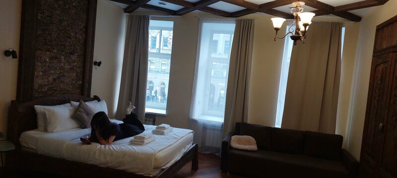 Отель понравился, пробыли 3 ночи в Новогодние празники . В отель можно с питомцами, с нами был кот🐱. Номер на 2 этаже, удобно нам лично, чтобы не шагать по лестнице на верхние этажи. Прекрасный вид на Невский проспект. Так же во дворике отеля есть платная платная парковка, которой мы воспользовались, очень удобно. Завтра снова приедем в этот отель Номера отличные просторные 25кв, шикарный вид из окон
