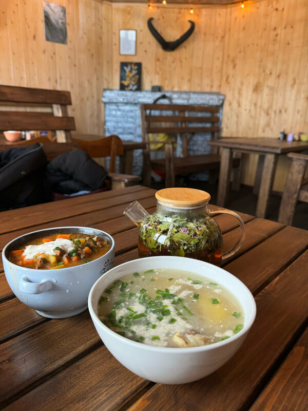 офигенно вкусный глинтвейн, шорпа соленоватая, а вот лагман в самый раз, но очень вкусно и то, и то) хычин с мясом тоже зачет. травянистый чай отлично согревает после подъема цены адекватные, супы по 500, хычин 300.