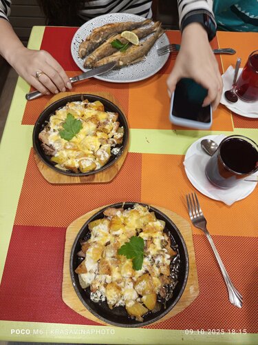 Были в кафе, все очень вкусно. Сбитень, поджарочка с картофелем, ряпушка, блины, все было очень вкусно.