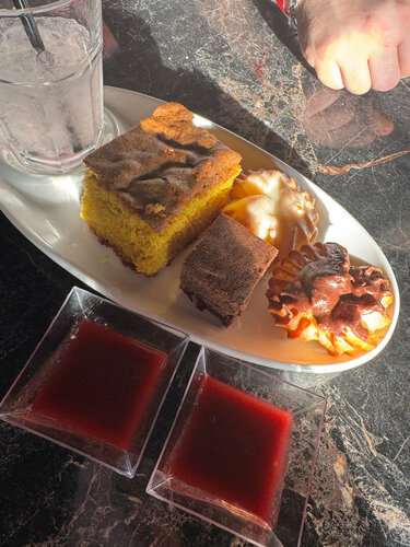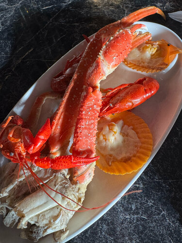 Визит 07.03.26 на «рыбный шведский стол». Из за того, что само 8 марта было уже давно распланированно, решили вдвоем пойти 7 марта пообедать. Впервые. Ибо была рекомендация, которую мы уже со своей стороны не передадим дальше 🙌 не внимательное отношение к гостям от слова совсем. К шведскому столу полагается докупить напиток, выбор которого мы озвучили на этапе надевания браслетов. Ну и выпрашивали мы его час-полтора. Полный игнор. Не скажу, что полная посадка. Нет, процентов 60. Мы и просили, и ходили сами , и напоминали, потом это уже даже стало нашим «развлечением» (если бы не было так грустно), как говорится. Ну вобщем нет… неприятно возвращаться. По поводу качества блюд на рыбном столе: ну зачем давать таких перемороженных уставших крабов (мы из Мурманска, уж знаем толк), пустых раков, по поводу гребешков я просто молчу - это что то из разряда «разгрызи камень и не сломай зубы и вилку»… вобщем в праздничные дни не порадовали… ну чтобы не заканчивать на совсем грустной ноте, скажу, что том ям неплохой и десертики вкусные довольно таки. Интерьер симпатичный, но лучше вечером конечно, чтобы нюансов «не замечать», как то потертые диваны, стол со сколотой дыркой посередине столешницы (повторюсь, мы были днем и светило солнце 🌞)