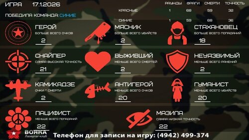 Приятные организаторы в меру строгие и честные. На игре ведётся полный сбор статистики попаданий и поражений цели, рейтинг и даже топ достижений, большая крутая локация, достаточно качественное оборудование. Зимой есть момент с вопросом как добраться, три семьи ошиблись плюс есть проблема с парковкой. Максимум внутрь на территорию заедет четыре машины. Спартанская раздевалка, но с магнитными замками, входную дверь лучше не закрывать ручки нет, а язычок есть, но пленниками не остались. Общее впечатление от игры отличное, спасибо за хорошо проведенное время.