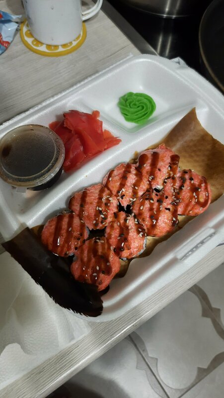 Как я понимаю, это ребрендинг Pizza store или их дочерняя организация. Поэтому по качеству все также вкусно! В отличие от Пицца стор, здесь пицца только квадратная, но в двух размерах, также есть роллы в меню. Брали сет Семейный на троих взрослых. Объелись! Правда запеченные роллы с крабом и с курицей были на вкус очень похожи из-за соуса в шапочке роллов (да и внешне в общем-то тоже, поэтому даже не стала фоткать второй). Кстати остатки пиццы, полежав в холодильнике, даже через день после разогревания в микроволновке остались мягкими, тесто не стало подошвой. Кстати, личный кабинет с пиццастором общий, можно авторизоваться и в Nono, чтобы копить и списывать баллы